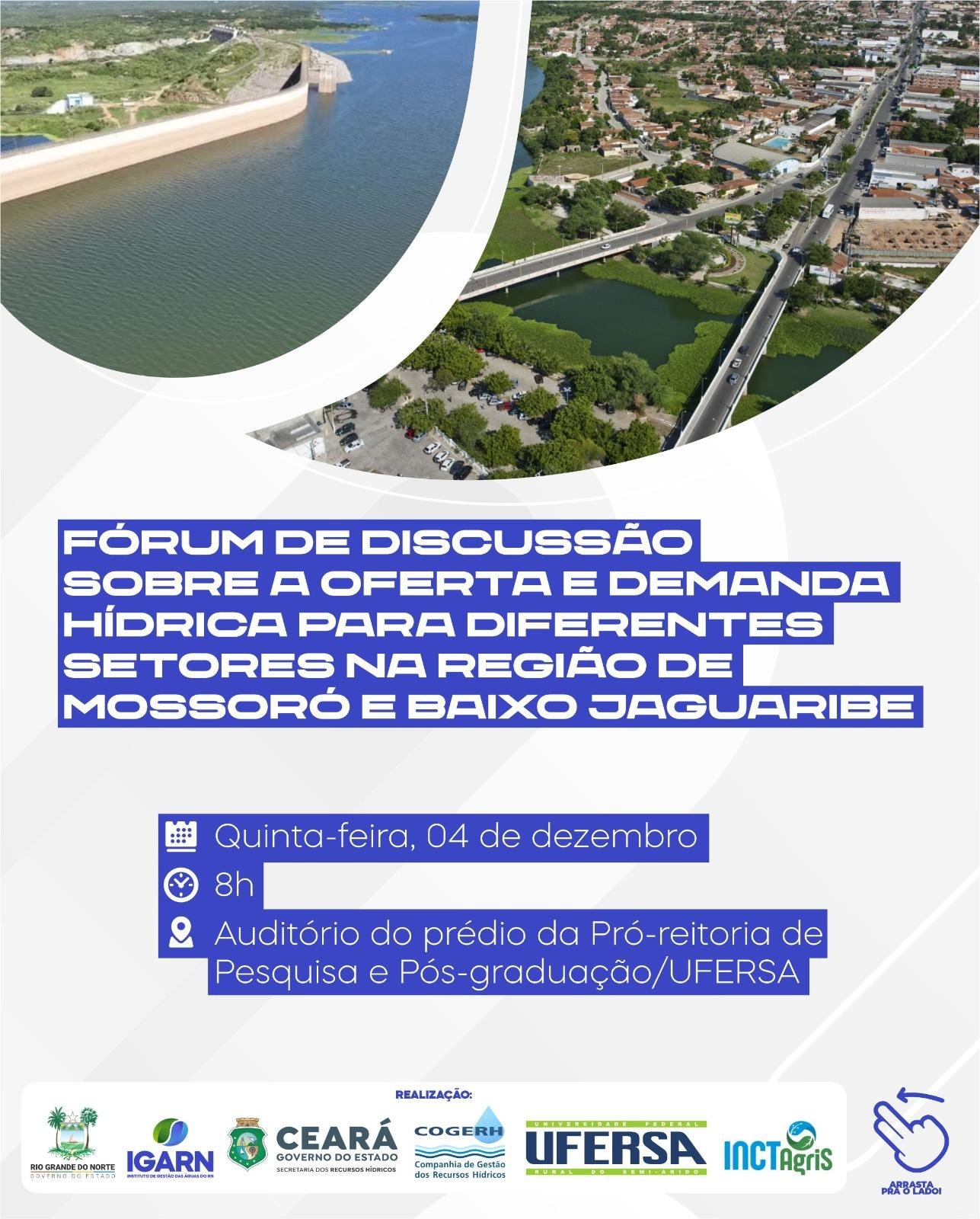 Na próxima quinta-feira, 04 de dezembro, será realizado o Fórum de Discussão sobre a Oferta e Demanda Hídrica para Diferentes Setores na Região de Mossoró e Baixo Jaguaribe, no Auditório da Pró-Reitoria de Pesquisa e Pós-Graduação da UFERSA, em Mossoró (RN). O evento reúne especialistas, gestores e representantes de instituições públicas e privadas para debater os desafios atuais relacionados à disponibilidade de recursos hídricos e às demandas produtivas e urbanas das regiões envolvidas.